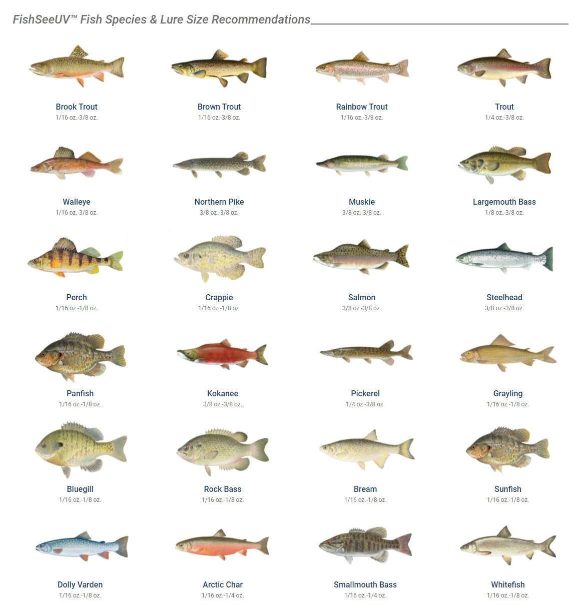 - The FishSeeUV Spinners in the 3 Pack are Size 4 (1/8 oz) with sharp treble hooks.